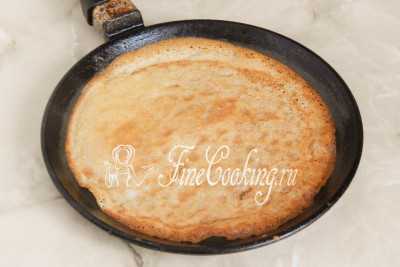 Печем в течение нескольких минут на небольшом огне, периодически проверяя готовность блина. После того как одна сторона блина подрумянилась, переворачиваем его и печем до полной готовности.