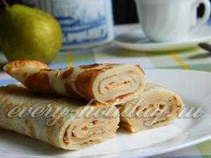 Тонкие блинчики, приготовленные по данному рецепту, превосходно подходят для разнообразных начинок. Это может быть фарш, грибы, сыр с ветчиной и многое другое. А в данном случае это сладкая начинка: крем из вареной сгущенки с маслом. Сами блинчики нет необходимости делать сладкими, поэтому приготовим их без добавления сахара.
