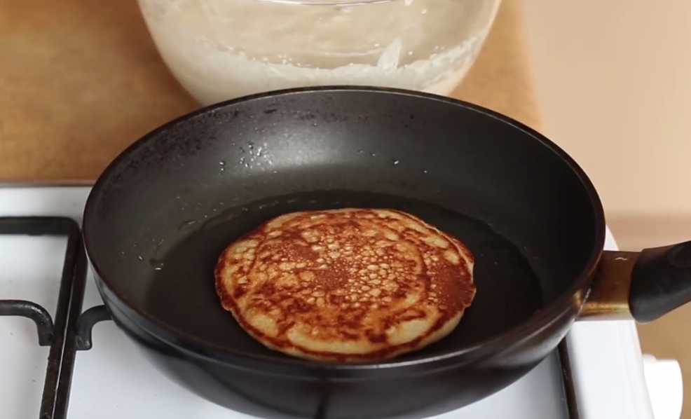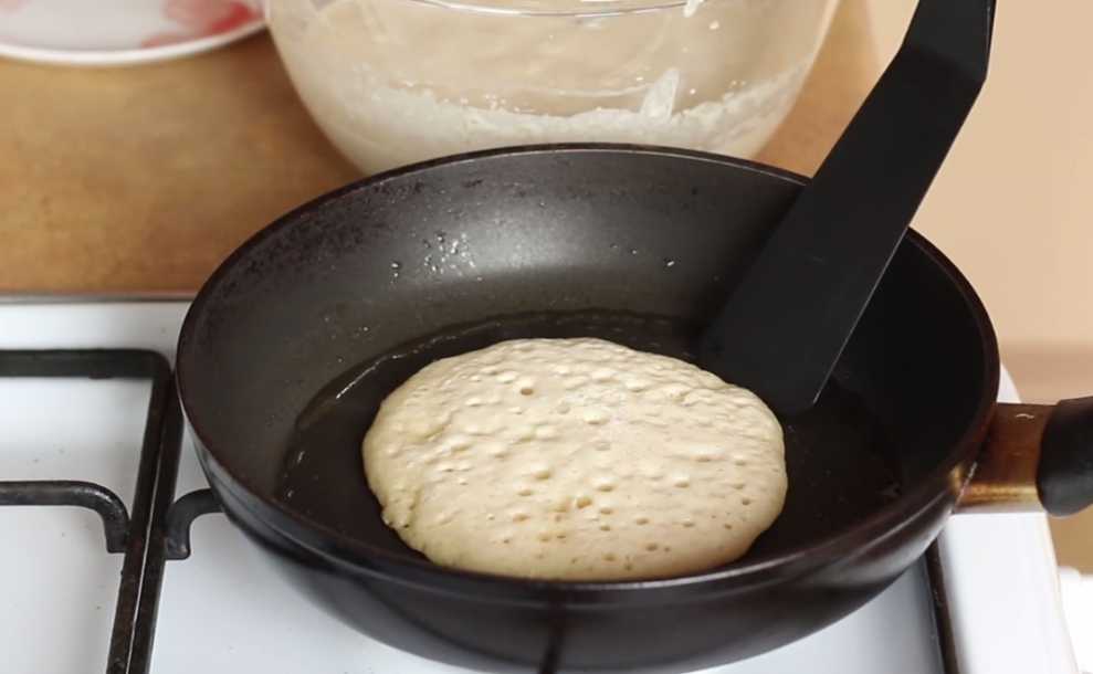 Примерно на каждую сторону блина уходит по 1.5 — 2 минуты. По необходимости можно накрыть сковородку крышкой.