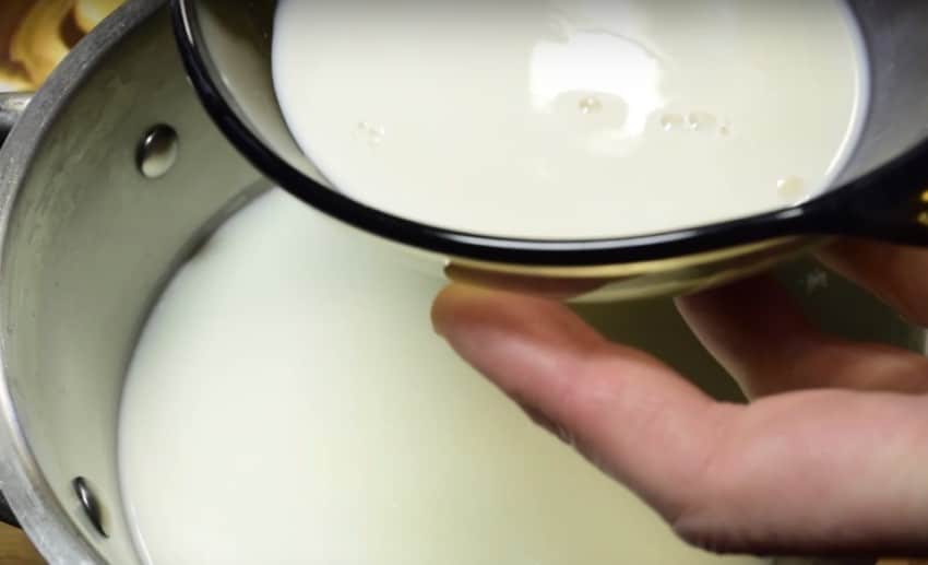 2. Налейте оставшееся молоко в кастрюлю и насыпьте в него сахар и щепотку соли. Туда же вылейте молоко с дрожжами из миски.