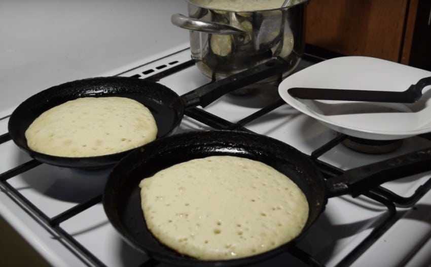 Теста получается очень много, так что быстрее и проще печь на двух сковородках одновременно. Если заканчивается масло на сковородах, по чуть-чуть подливайте в процессе.