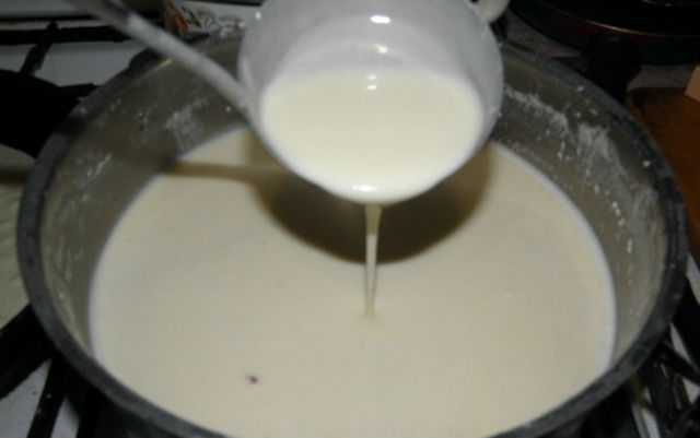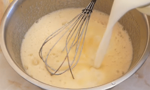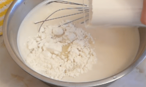 Добавить муку, замесить жидкое тесто, в котором не должно быть комочков.