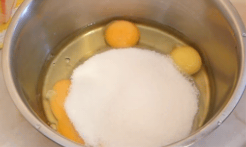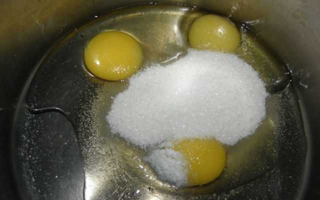 В подготовленной глубокой чаше взбиваем яйца смешанные с солью, сахаром и растительным маслом.