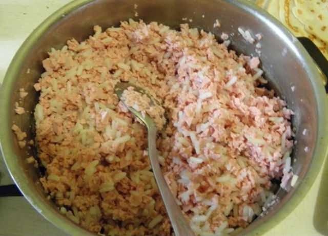 Колбаску измельчаем как можно мельче и перемешиваем с варенным рисом.
