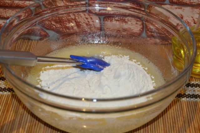 В приготовленную смесь всыпаем муку и все хорошенько взбиваем, чтобы не было комочков.
