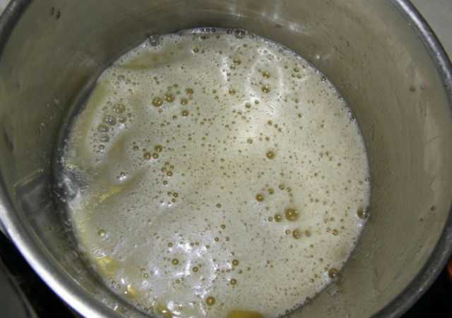 - Затем отливаем из общей массы полстакана теплой жидкости, она нам понадобится позже.