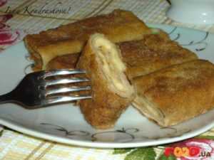 - Окуните треугольник блинный в яичную смесь и обжарьте с двух сторон на сковороде.