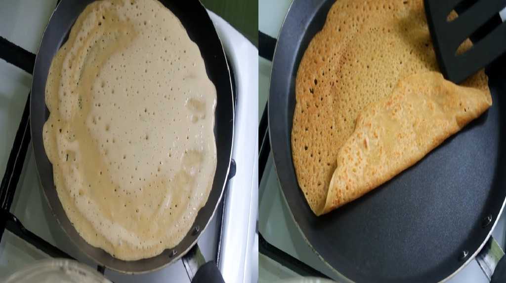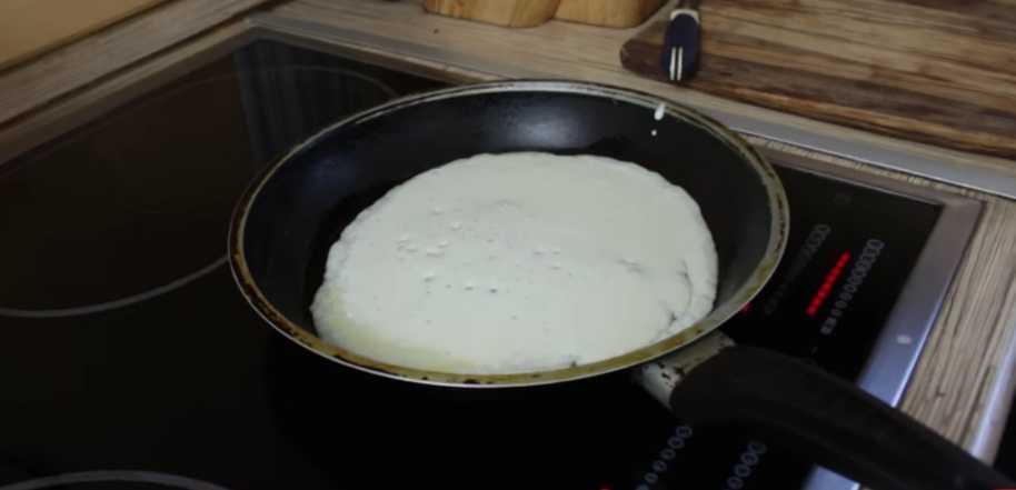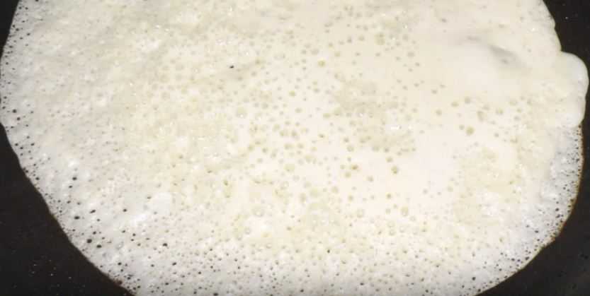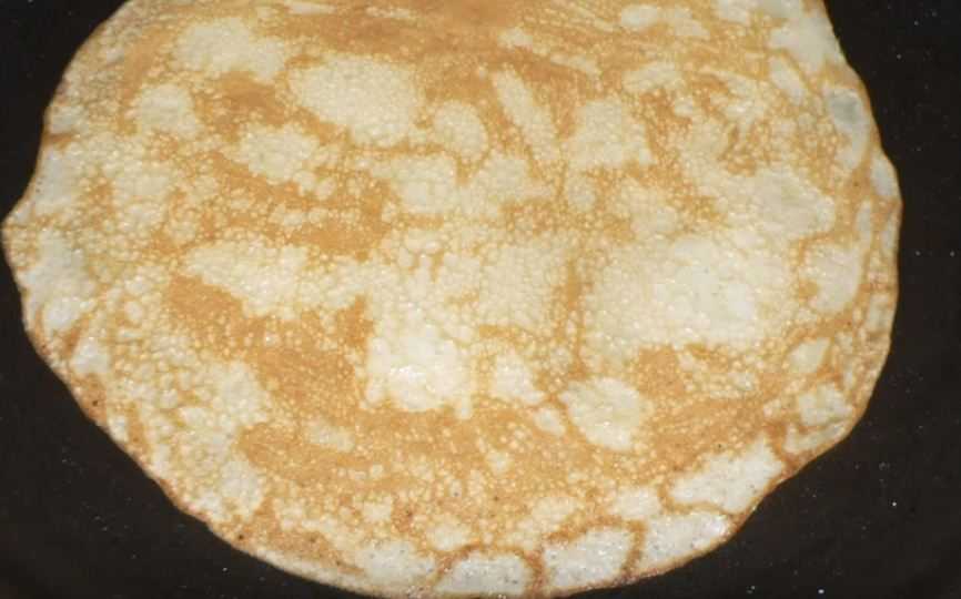 4. Раскаляем сковороду и вливаем порцию теста тонким слоем. Когда заметите, что поверхность подсохла — сразу же переворачивайте.