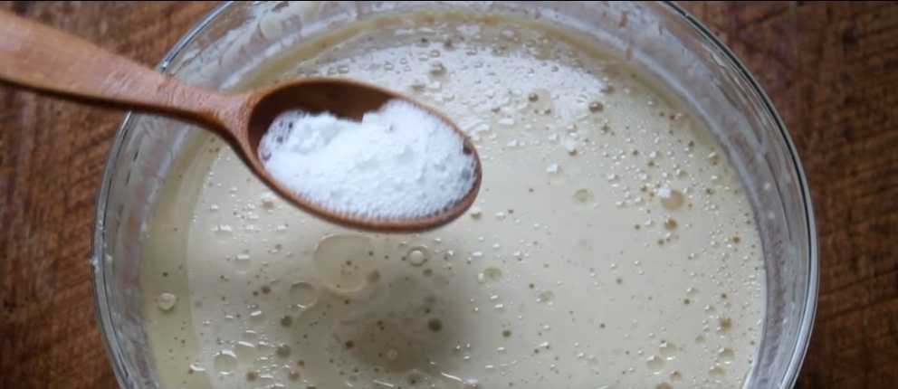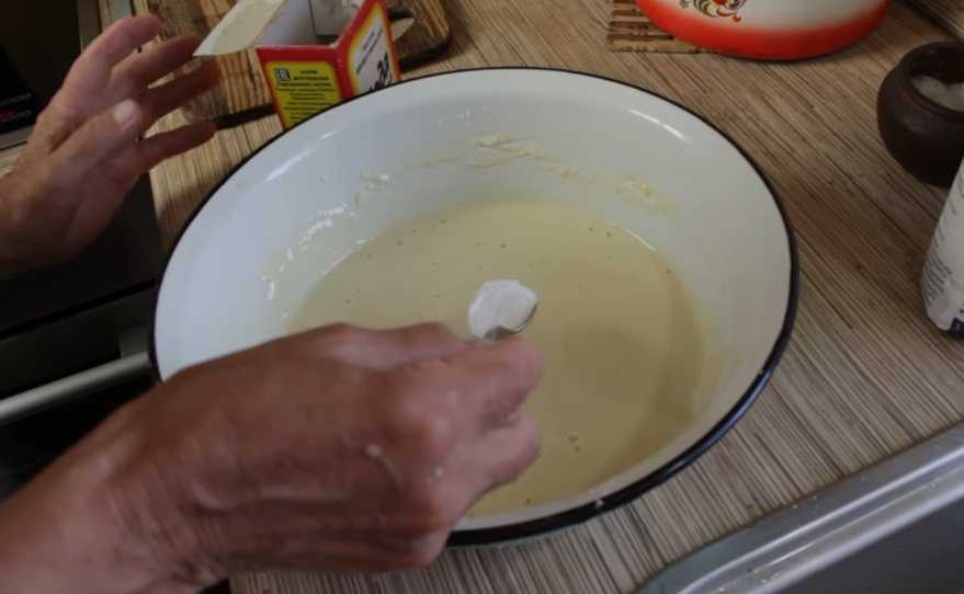 Сверху аккуратно насыпьте чайную ложку соды, ингредиенты не перемешивайте пока не закипит вторая часть сыворотки.