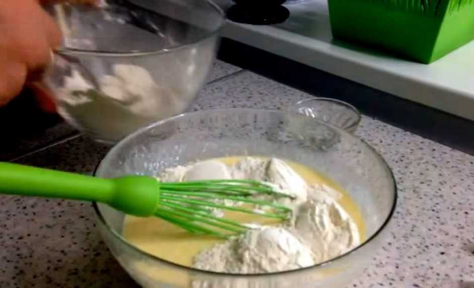 4. Добавить просеянную муку и снова перемешать. Здесь уже потребуется смешать все компоненты до однородности. Также в тесте не должно остаться комочков. Следите за этим. Это залог Вашего успеха! Для удобства и быстроты взбивания можно воспользоваться миксером.