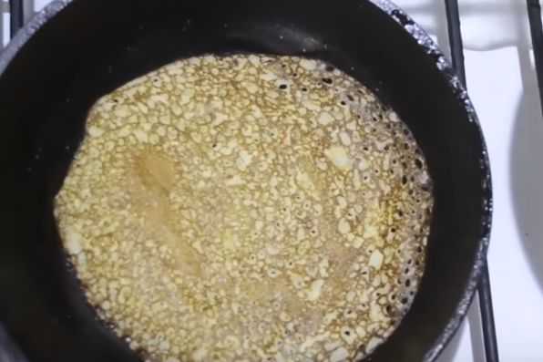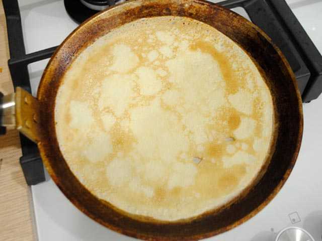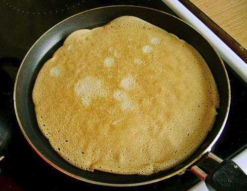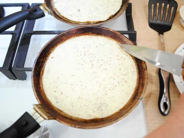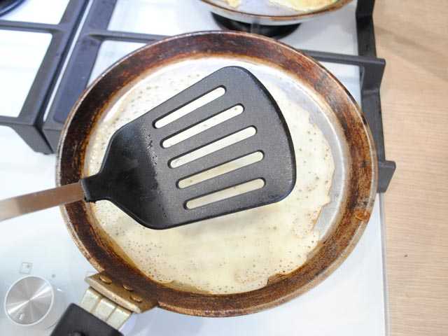 — ставим сковороду на огонь и ждём, пока поверхность блина не станет сухой, а края не зарумянятся;