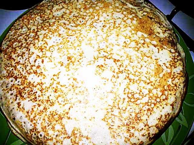 5. Сковородку смазываем маслом и хорошо нагреваем, берём пол половника теста и наливаем на сковороду, нагибая в разные стороны.
