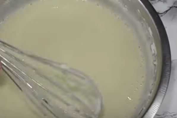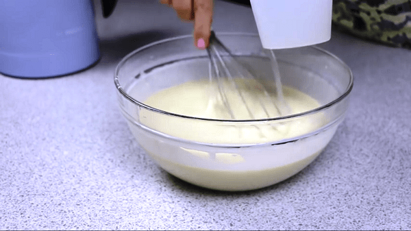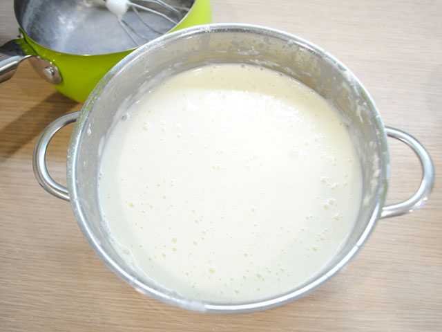 5. Горячее молоко влить в уже полученную массу. Вливать лучше тонкой струйкой, держа стакан (или кружку) с горячим молоком, в одной руке, а другой рукой в это же время активно перемешивать смесь венчиком, или миксером.