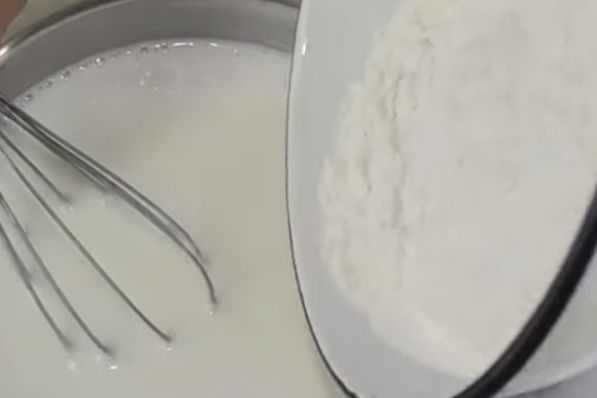 3. Добавьте муку. Тщательно размешайте до растворения комочков. Постепенно влейте остатки молока.