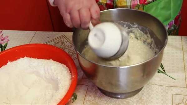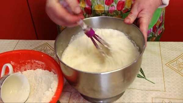 4. Добавить просеянную муку и снова перемешать. Здесь уже потребуется смешать все компоненты до однородности. Также в тесте не должно остаться комочков. Следите за этим. Это залог Вашего успеха! Для удобства и быстроты взбивания можно воспользоваться миксером.