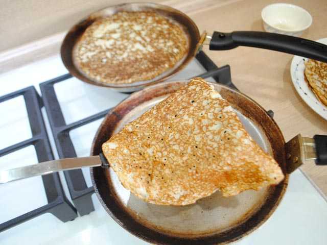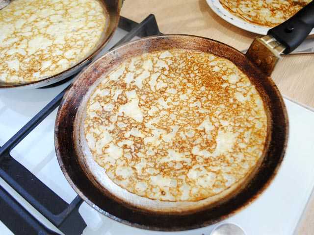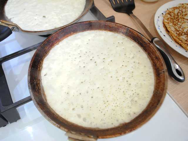 - Подбираем сковороду. Какие бы нам не предлагали современные сковородки — антипригарные, удобные, легкие — лучшей остается чугунная сковорода. И дело не в старинных традициях, а в ее толстых стенках, которые хорошо держат тепло и равномерно прогреваются, а ее поверхность не позволяет тесту прилипать. К тому же, чугунные сковороды долговечны и не боятся перепада температур. Да, они продаются не на каждом углу, но найти можно. В наше время даже Китай делает отличные чугунные сковороды.