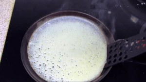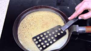 - Когда увидите, что краешек подсох, проведите ножом между ним и поверхностью сковородки. Тем самым помогая краю не прилепляться к поверхности.