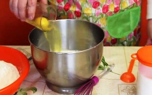 3. При помощи венчика перемешаем и добавим 3 куриных яйца, которые тоже должны быть комнатной температуры.