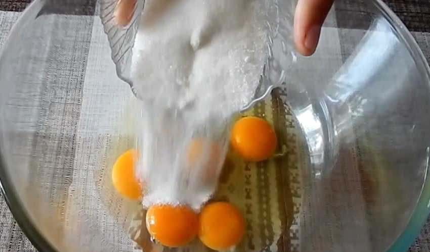 1. В глубокую миску разбейте яйца и смешайте их миксером с сахаром.