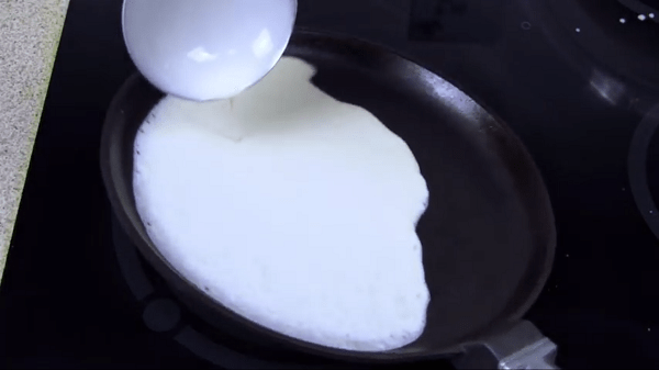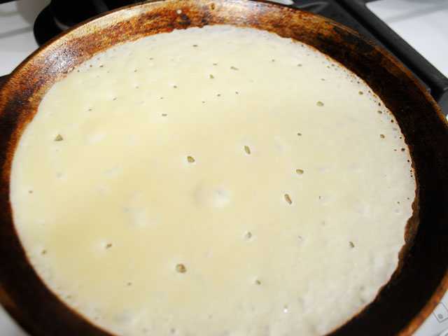 — наклоняем сковороду и наливаем на неё тесто, при этом одновременно делая резкое круговое движение, чтобы вся поверхность сковороды была покрыта равномерным слоем теста;