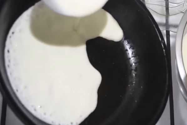 - Теперь можно выливать тесто сковороду с помощью половника. Его уже не нужно перемешивать, а только набирать и равномерным слоем выливать для жарки.