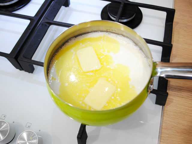 4. Оставшиеся 0,5 литра молока поставить в кастрюлю греться. Выложить туда же сливочное масло. Довести смесь до кипения при помешивании.