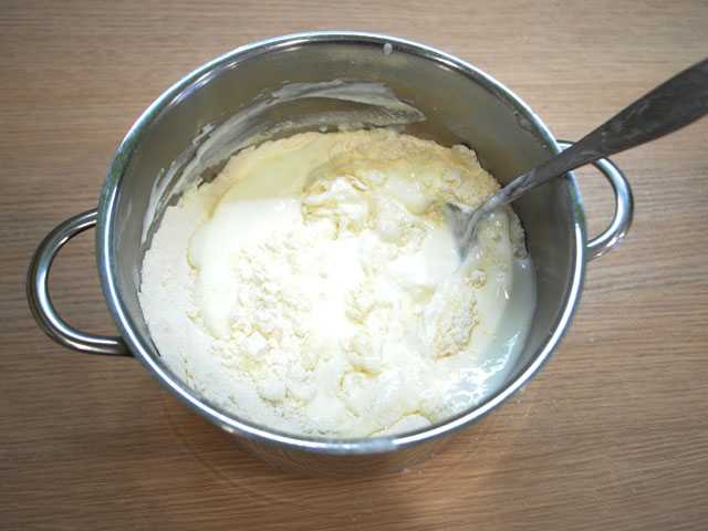 - В другую миску просеивают муку, добавляют подогретое молоко, тщательно размешивают. В итоге получается заварное тесто. Его немного охлаждают. После остывания выливают ранее подготовленную молочно-дрожжевую смесь. Полученную массу хорошо перемешивают, накрывают салфеткой и оставляют в тепле на 40 минут.
