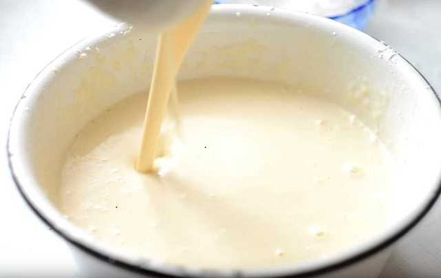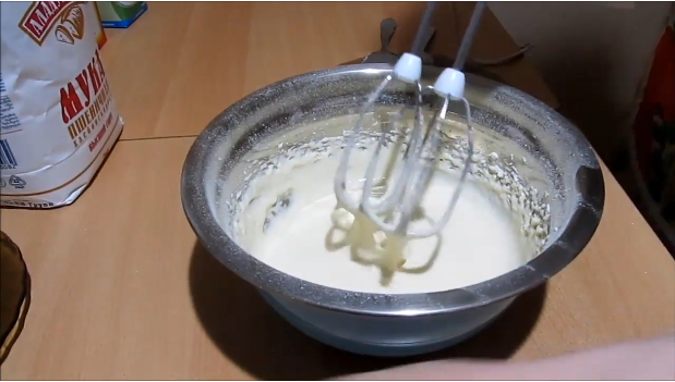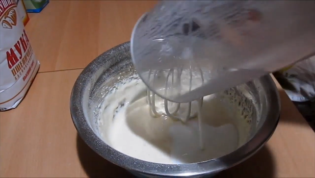 - Через сито засыпать муку и взбивать миксером 3 минуты. Продукт лучше добавлять постепенно и следить за состоянием теста. Оно понадобится средней густоты.