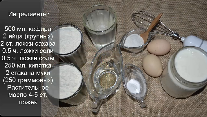 Кипяток в этой рецептуре позволит сделать блины тоненькими и ажурными. Здесь кефир тоже подогревается, а яйца заранее достаются из холодильника. Теплая температура ингредиентов способствует лучшему соединению.
