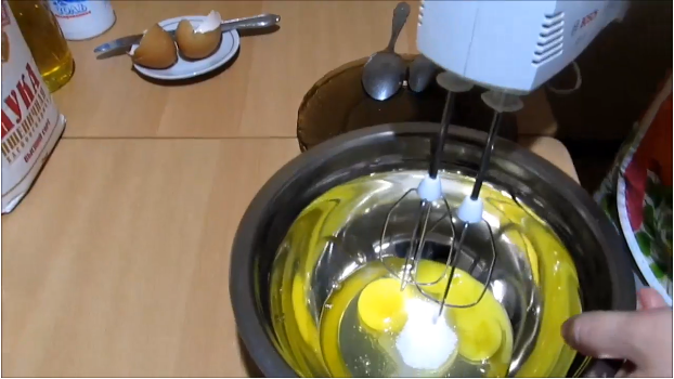 - В сахарный песок насыпать яйца. Размешать венчиком. Подсолить. Насыпать сахарный песок и взбить миксером.