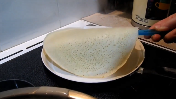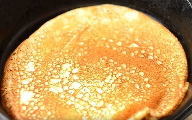 4. Когда на поверхности не останется участков сырого теста, она покроется пикантными дырочками, а по краям проявится румянец, переворачиваем изделие. Поджариваем теперь с другой стороны.
