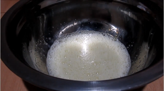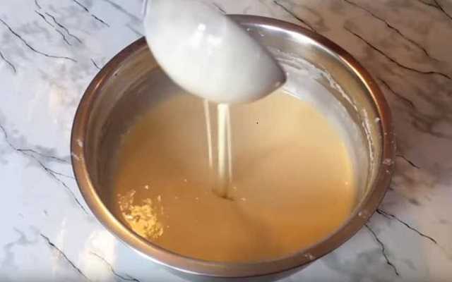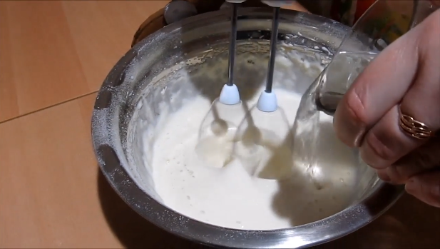 - Полученный раствор тоненькой струйкой вливают в тесто и постоянно помешивают.