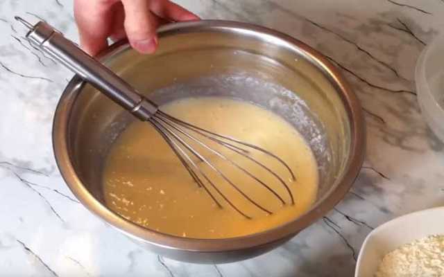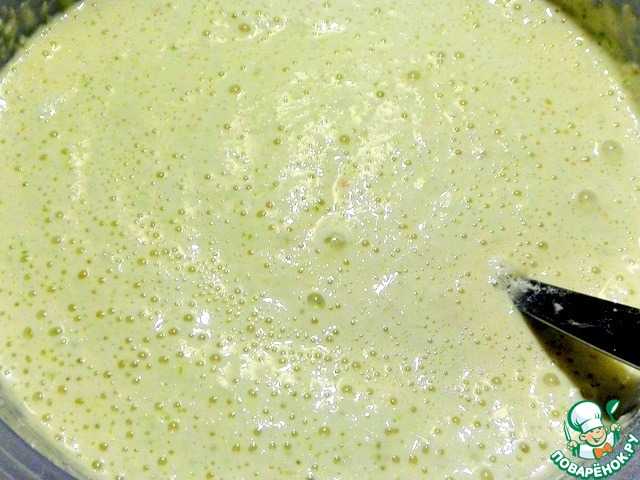 - Рисовую муку медленно вмешать в кефир с яйцами. Получится густоватая масса. Взбить ее миксером или просто вилкой, и пусть постоит немного.