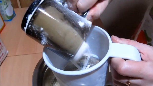 - Муку просеивают через сито. Всыпать к кефиру и яйцам, при этом постоянно работая миксером. Необходимо следить, чтобы не образовывались комочки.