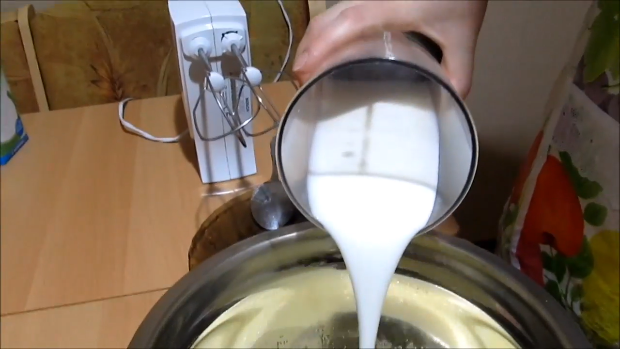 - Теплый кефир влить в кастрюлю и добавить к нему яйца. Затем миксером перемешать продукты.