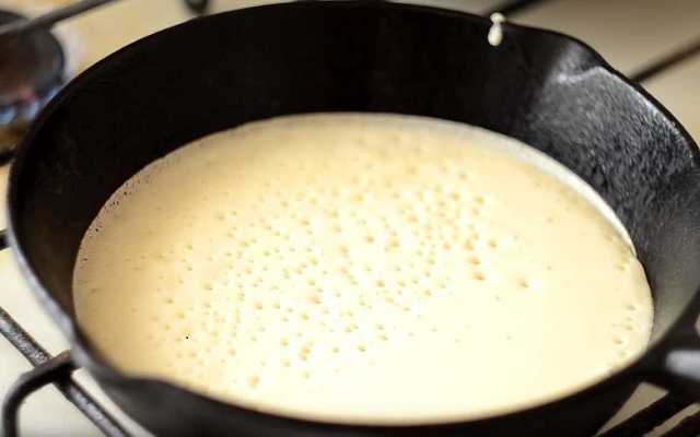 - Поварешкой зачерпнуть массу и залить в центр сковородки, затем равномерно разравнять. Толщина должна получиться 5 миллиметров. Закрыть крышкой. Когда на поверхности образуется легкая корочка, перевернуть.