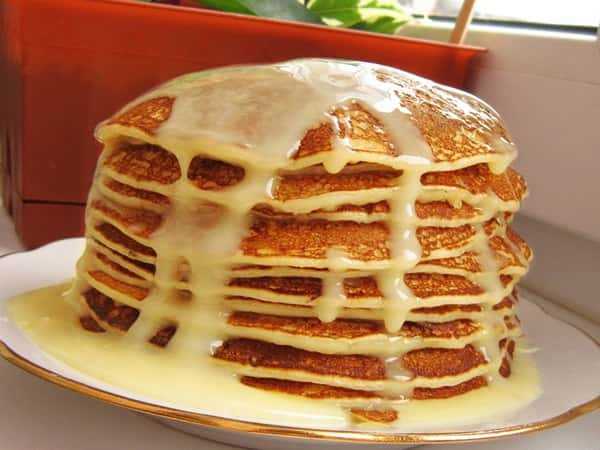 5. Таким же образом поступаем со всем тестом. Стопку блинов сразу несем к столу. С чем будете подавать, решайте сами. Варенье, джем, красная икра, мед, сметана, сгущенка. А может быть что-то еще. Вкусно будет в любом случае!