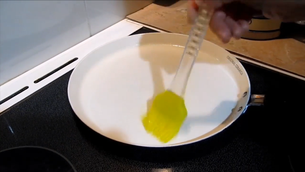 - Раскалить сковородку. Промазывать ее можно рафинированным, сливочным или оливковым. Удобнее всего использовать сковороду диаметром 22 сантиметра.