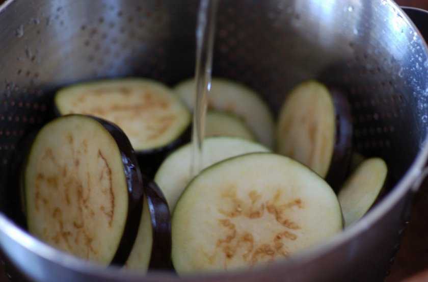 Вымачивать баклажаны рекомендуют в холодной соленой воде (1 ст. л. соли на 1 л воды). Нарезанные овощи необходимо опустить в рассол, сверху прижать тарелкой или разделочной доской и поставить груз. Через 40 минут овощи следует промыть от соли в проточной воде и выложить на бумажные полотенца, чтобы стекла вода.