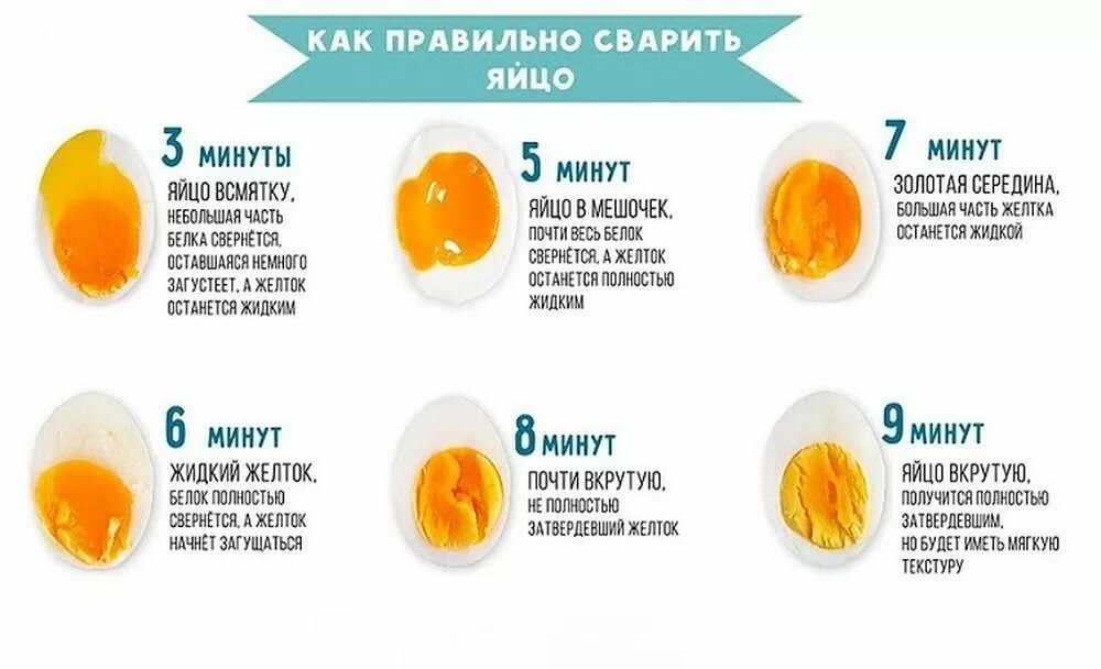 В зависимости от времени варки, яйца получаются всмятку (с жидким белком и желтком), в мешочек (мягкий белок и жидкий желток) или вкрутую (твёрдый белок и желток).