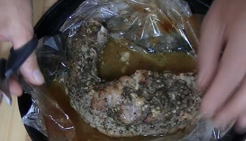 8. Затем мясо выньте из духовки и разрежьте рукав. Поставьте его обратно в духовку еще на 10 минут до появления румяной корочки.