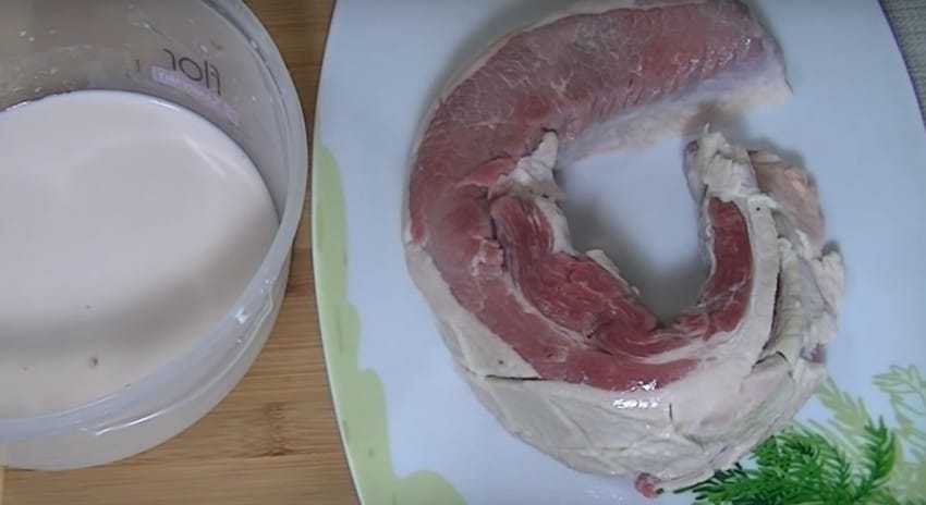 2. Мясо положите в неметаллическую миску и залейте молоком. Оставьте мариноваться часов на 8. В течение указанного времени нужно один раз перевернуть кусок.