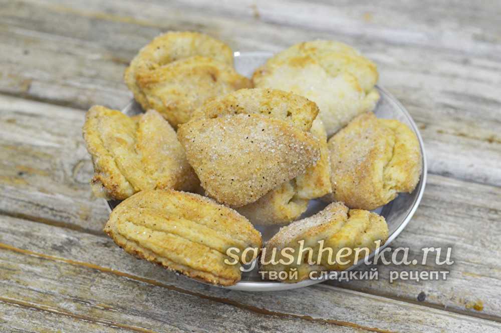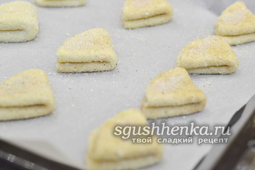 Заготовки обваляйте в смеси из сахарного песка и корицы, сложите пополам два раза, чтобы получилось треугольное печенье.