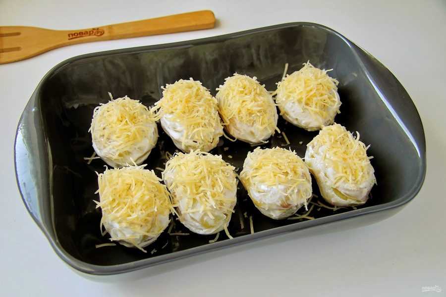 Наполните «лодочки» фаршем, смажьте сметаной и посыпьте оставшимся сыром. Выложите картошку в форму, влейте полстакана воды, накройте фольгой и отправляйте в духовку на 20 минут при температуре 200 градусов. Затем фольгу снимите и готовьте еще минут 5-8, пока сыр не зарумянится.