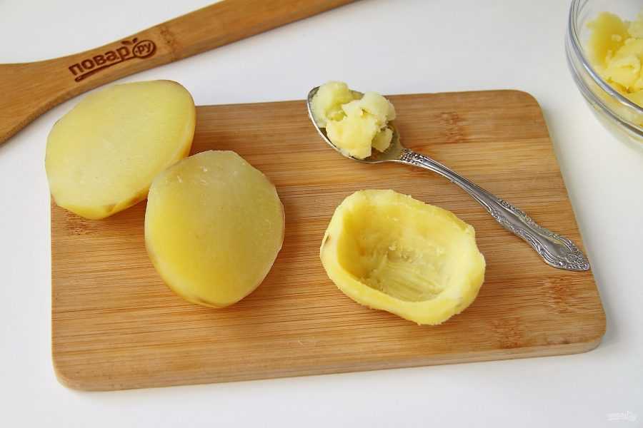 Из вареной картошки сделайте своеобразные лодочки, выскребав ложкой мякоть.