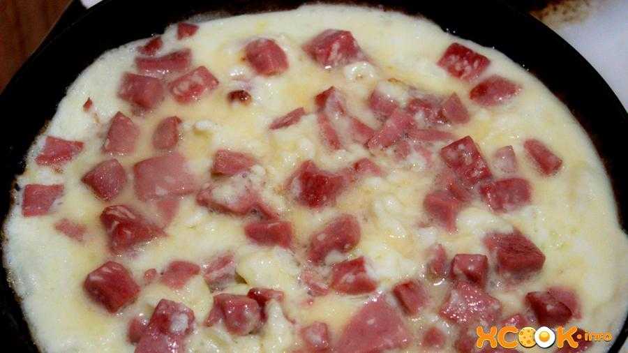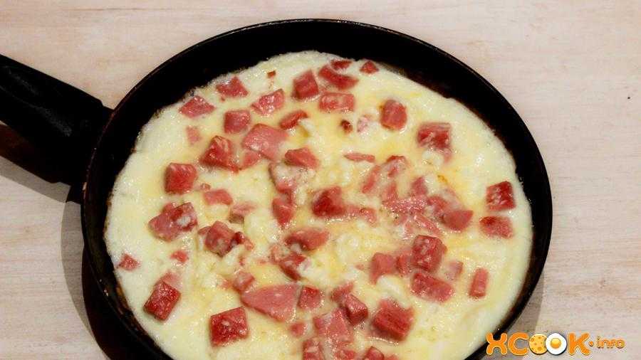 При вливании слой омлетной массы должен составить не менее 3 см, нагреваясь, она поднимется почти наполовину. Вот почему сковорода нужна высокая. Бортики хорошо смазать маслом.