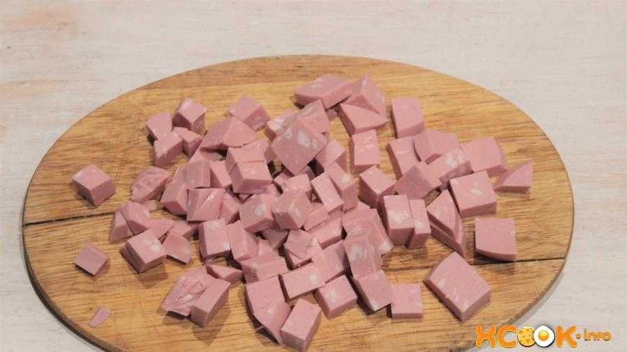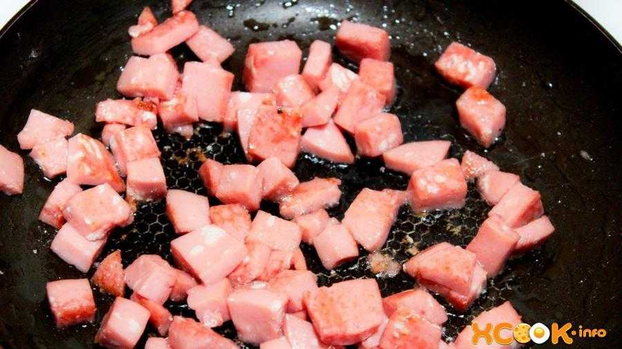 - Лук очистите и нарежьте полукольцами. Обжарьте на растительном масле 2-3 минуты лук. Добавьте нарезанную соломкой ветчину и колбасу. Обжаривайте 3-5 минут. Колбаса должна начать румяниться. Добавьте нарезанный кружочками картофель. Оставьте жариться, пока готовите яйца.