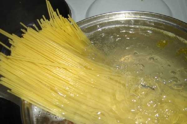 - опускаем пасту в кипяток, длинные спагетти не нужно предварительно ломать – после попадания в кипящую воду они моментально становятся мягкими и послушно «складываются»;