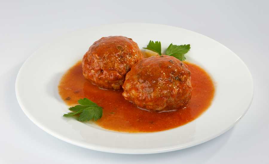 Сформируйте из полученной массы круглые тефтели размером с грецкий орех или побольше. Уложите их в смазанную форму. Подготовьте соус для тушения из томатной пасты с водой, из кетчупа с водой или просто используйте томатный сок. Залейте томатным соусом тефтели примерно на половину их высоты.