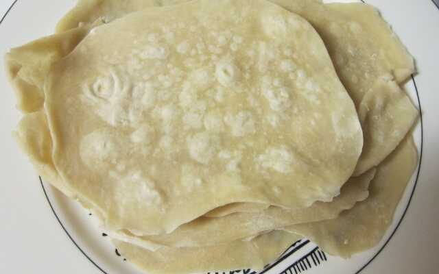 Перед использованием муку необходимо просеять. После добавляется соль, сода, медленно вливается минеральная вода. Содержимое тщательно перемешивается до получения однородной массы.